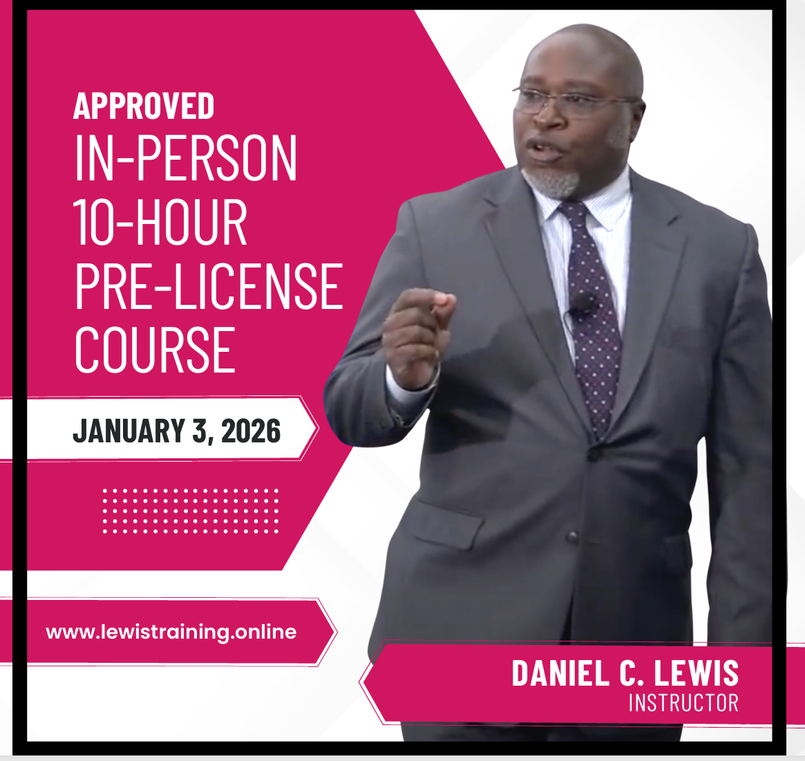 Approved Title Pre-License Course. The first part of this course will be online and the next part will be an in-person workshop. The in-person portion of this workshop will be on Saturday, January 3, 2026, starting at 9:15 am and held at